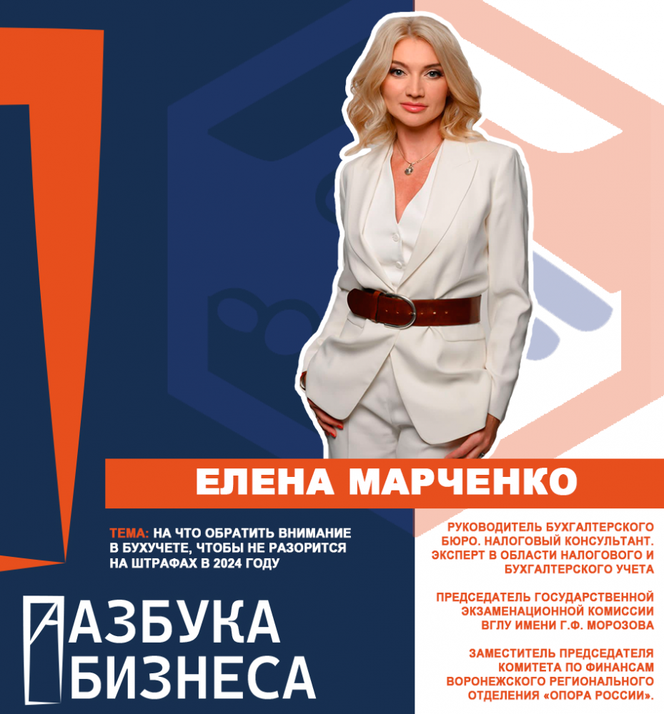 Марченко Елена - Руководитель бухгалтерского бюро. Налоговый консультант, эксперт в области налогового и бухгалтерского учета. Председатель государственной экзаменационной комиссии ВГЛУ имени Г.Ф. Морозова. Заместитель председателя Комитета по финансам Воронежского регионального отделения «Опора России»
