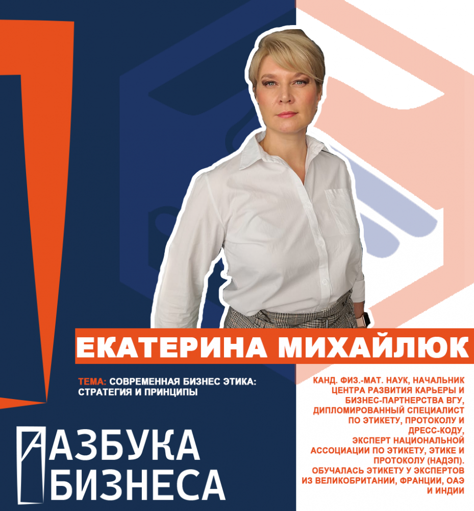 Михайлюк Екатерина Андреевна - кандидат физико-математических наук, начальник Центра развития карьеры и бизнес-партнерства ВГУ, дипломированный специалист по этикету, протоколу и дресс-коду, эксперт Национальной ассоциации по этикету, этике и протоколу (НАДЭП), прошедшая обучение этикету у экспертов из Великобритании, Франции, ОАЭ и Индии раскрыла стратегию и принципы в современной бизнес-этики.