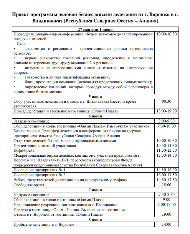 Программа включает: проведение биржи контактов и прямых переговоров между предприятиями МСП; проведение делового завтрака для членов воронежской делегации; посещение 1-2 предприятий потенциальных партнеров из г. Владикавказ.