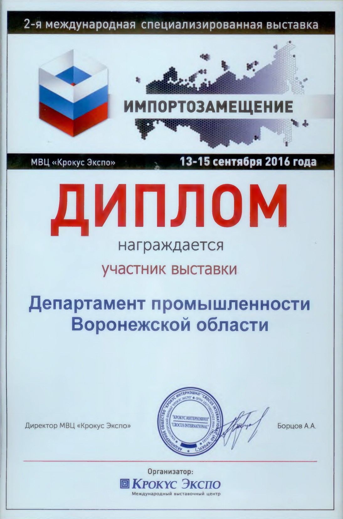 Таких комментариев участников заслужил стенд Воронежской области на 2-ой международной специализированной выставке «Импортозамещение», которая прошла 13-15 сентября 2016 в Москве в Крокус Экспо.Предприятия-участники от Воронежской области представили все секторы экономики региона - от информационных технологий до аграрного сектора.