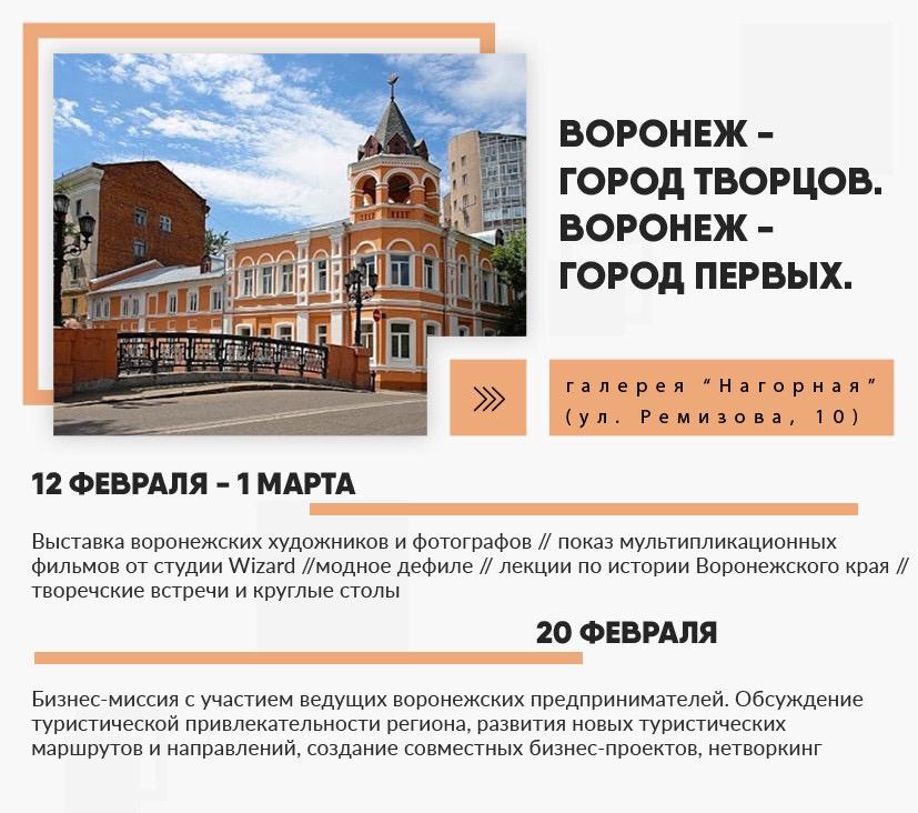 20 февраля 2020 года в Москве состоится бизнес-миссия Воронежской области. В рамках мероприятия будут презентованы актуальные достижения креативного класса Воронежской области - одного из наиболее интересных регионов центра России, с точки зрения истории и развития культуры.