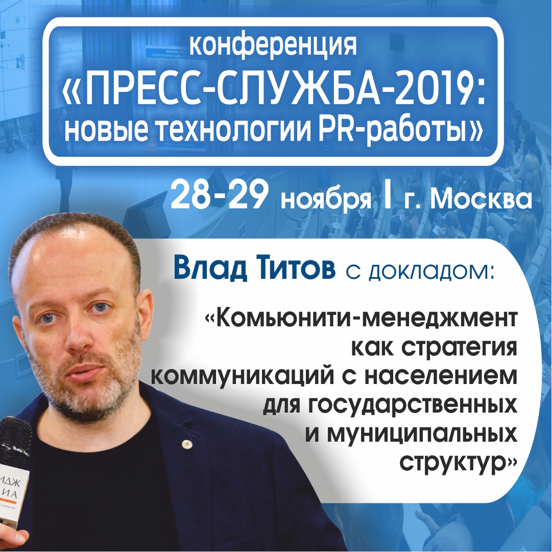 С таким докладом выступит руководитель Лаборатории Комьюнити Влад Титов на ежегодной международной практической конференции «ПРЕСС-СЛУЖБА-2019: новые технологии PR-работы», которая состоится в Москве 28-29 ноября.
