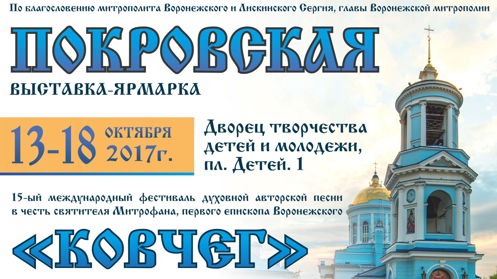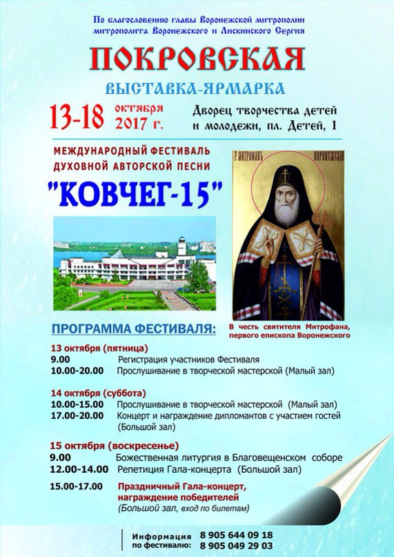 По благословению митрополита Воронежского и Лискинского Сергия с 13 по 18 октября в воронежском Дворце творчества детей и молодежи (пл. Детей, 1) прошла традиционная Покровская выставка-ярмарка и фестиваль духовной авторской песни «Ковчег».