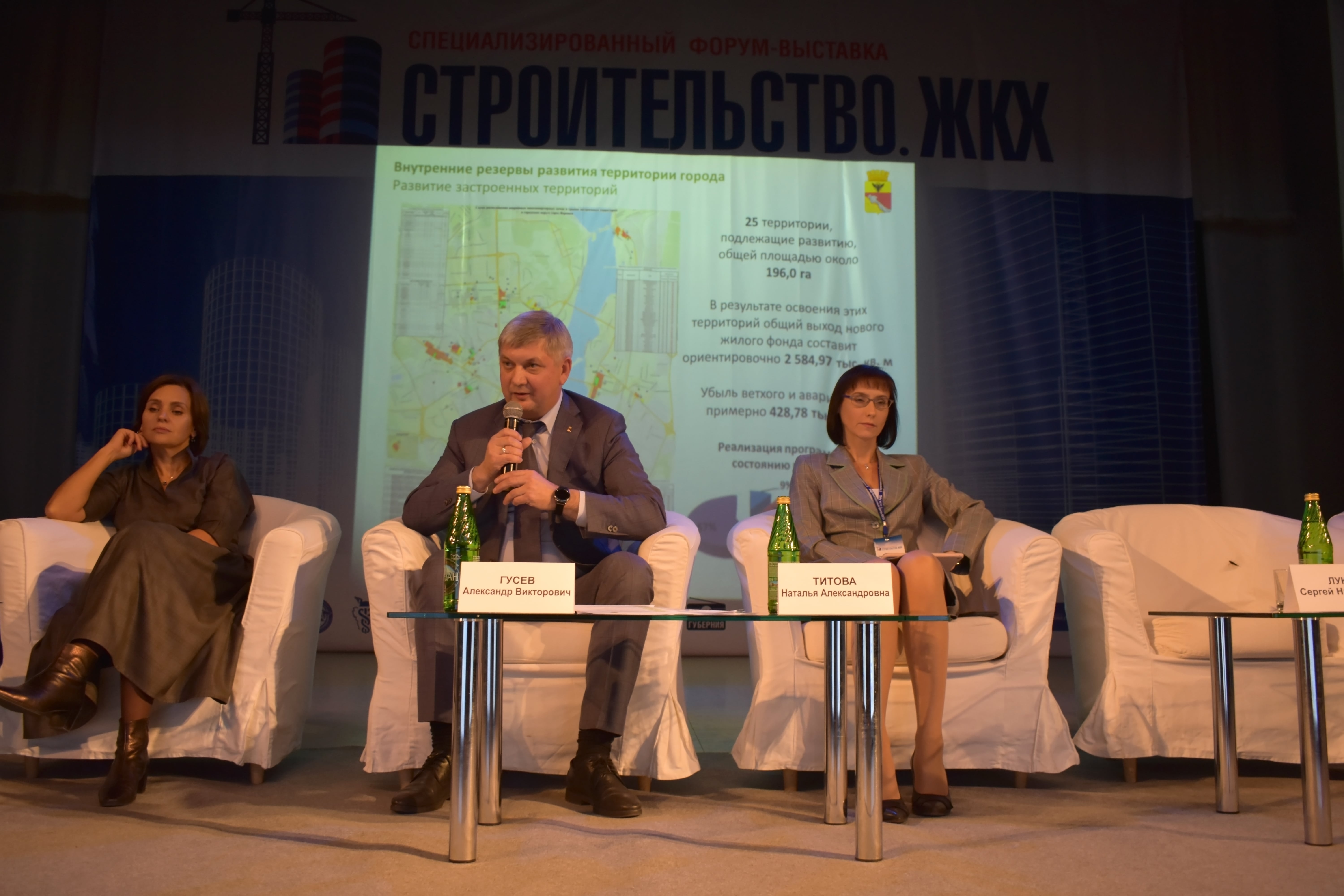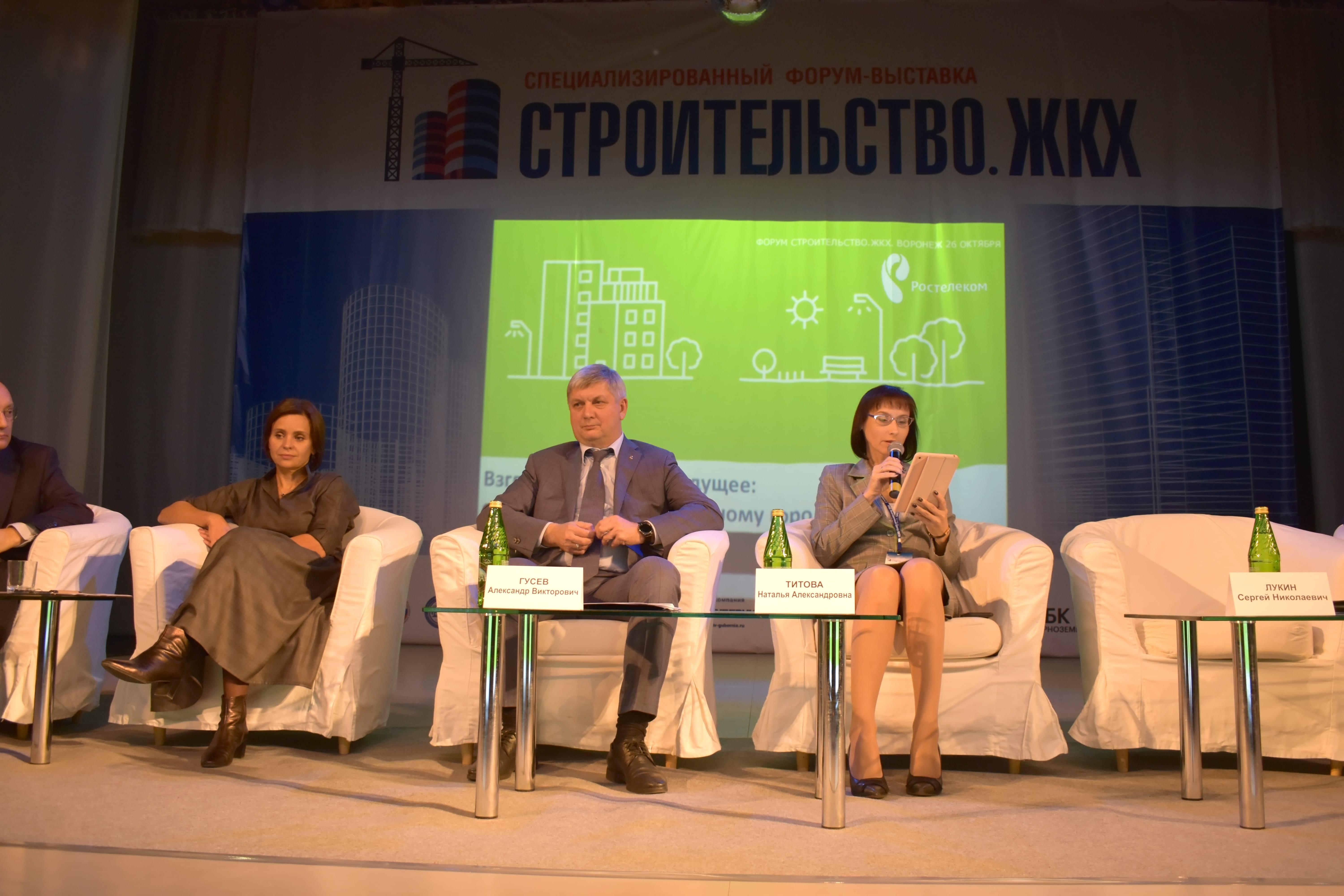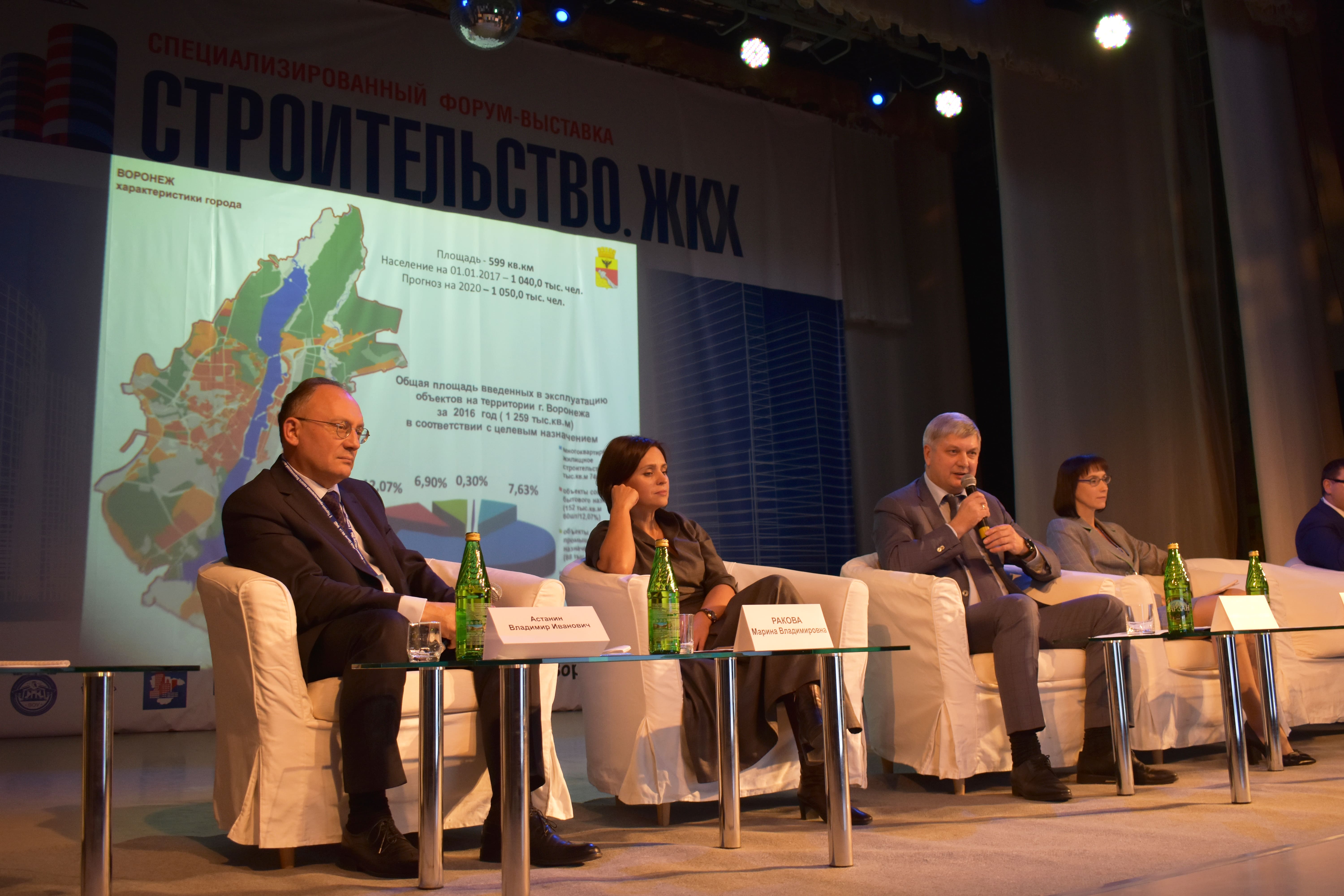 Спикерами выступили: В.А. Шабалатов, заместитель председателя правительства Воронежской области, С.Н. Лукин, Член Совета Федерации Федерального Собрания Российской Федерации, И.Д. Шкуматов, руководитель департамента промышленности Воронежской области, М.А. Оськин, руководитель департамента транспорта и автомобильных дорог ВО, А.В. Гусев, Глава городского округа город Воронеж, С.А. Петрин, руководитель управления ЖКХ г. Воронежа, А.В. Тимошенко, главный архитектор ДОАО «Газпроектинжиниринг», А.И. Соболев, заместитель генерального директора по экономике АО «ДСК», Г.К. Веретельников, Советник директора ОЦКС, Госкорпорации «РОСАТОМ», С.А. Колодяжный, Ректор ФГБОУ ВО «ВГТУ», Н.А. Титова, Директор Воронежского филиала ПАО «Ростелеком» и многие другие представители власти, и эксперты строительной отрасли.